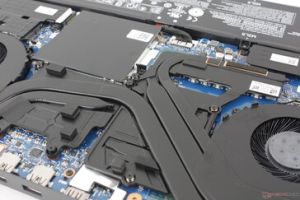 The Legion Pro 5i is equipped with dual 60mm fans connected to the core components with five copper heat pipes. There is one shared heat pipe for the CPU and GPU, one dedicated heat pipe for the CPU and GPU each and another smaller heat pipe for the VRMs. The system in takes air from the side and bottom grilles and exhausts air through the back grilles.[4]